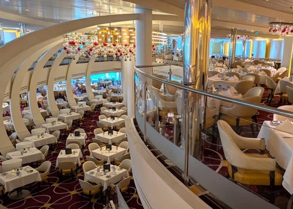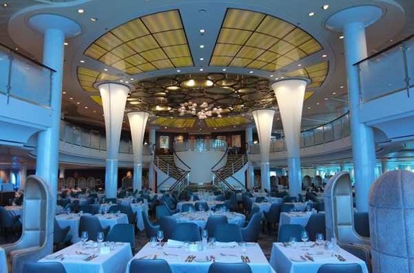 Elegant main dining room on Celebrity Cruises ship with chandelier ceiling and multiple tables