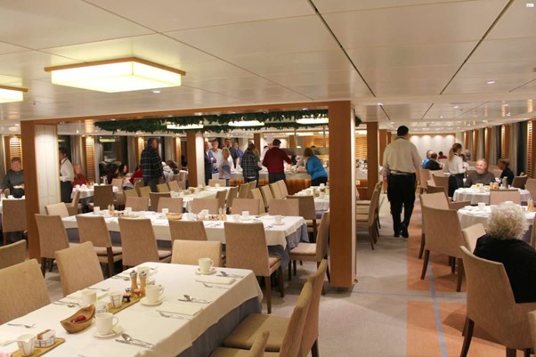 Viking Ocean Cruises elegant dining room with tables set for meals and passengers
