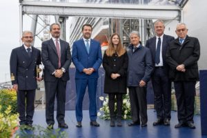 During the ceremony, Cristiano Bazzara, Fincantieri’s shipyard director, gave an ampoule containing the water that first contacted the hull when the ship was floated out earlier this year to Captain Roberto Leotta, Master of MSC Seascape.