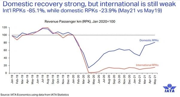 The International Air Transport Association (IATA) has announced that both international and domestic travel demand showed marginal improvements in May-2021, compared to the prior month, but traffic remained well below pre-pandemic levels and is lagging the increasing consumer confidence. Recovery in international traffic continued to be stymied by extensive government travel restrictions.